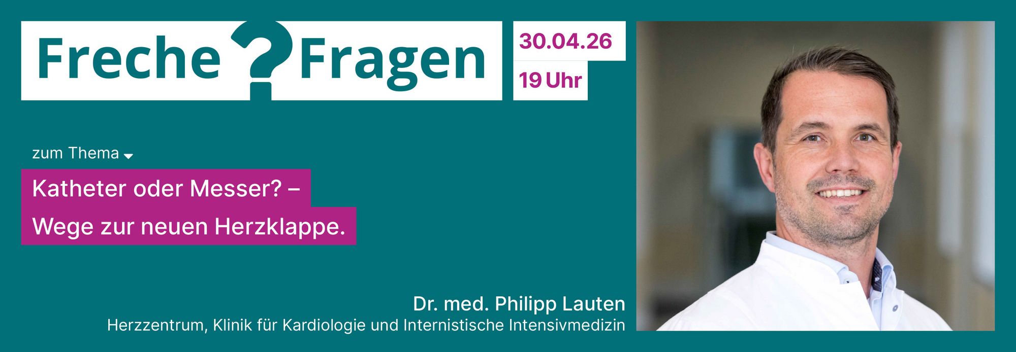 Bad Berka/Erfurt, 27. April 2026 --- Die „Frechen Fragen“ an Chefärzte im Erfurter Haus Dacheröden beschäftigen sich in diesem Monat mit Möglichkeiten, wie man zu einer neuen Herzklappe kommen kann. Der dazugehörige Vortrag von Dr. med. Philipp Lauten, Chefarzt der Klinik für Kardiologie und Internistische Intensivmedizin, beginnt am 30. April 2026 um 19 Uhr.