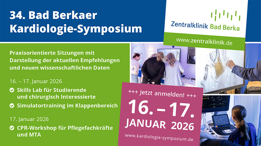 Bad Berka, 15. Januar 2026 --- Rund 400 Ärztinnen und Ärzte sowie Pflegekräfte werden in diesem Jahr zum „Bad Berkaer Kardiologie-Symposium“ am 16. und 17. Januar erwartet. Zum 34. Mal stellen Vorträge und Workshops aktuelle Entwicklungen bei der Diagnostik und Therapie von Herzerkrankungen dar. Dabei reicht das Spektrum von Herzklappentherapien, Herzinsuffizienz, koronarer Herzerkrankung bis zu Herzrhythmusstörungen und den Möglichkeiten der „Jungen Kardiologie“. Workshops und Fallbesprechungen ergänzen das interaktive Angebot.